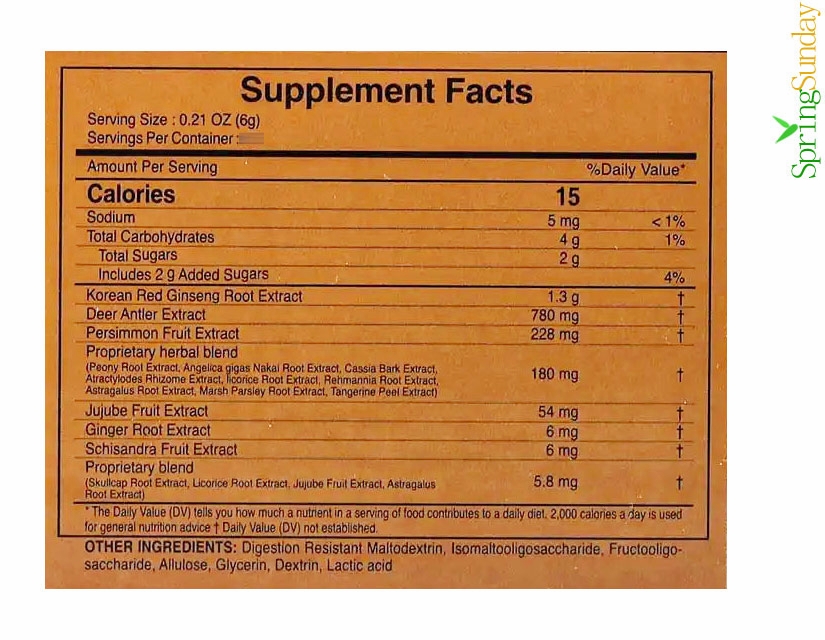 Korean Red Ginseng Root Extract, Deer Antler Extract, Persimmon Fruit Extract, Proprietary Herbal Blend (Chinese Peony Root Extract, Angelica gigas Nakai Root Extract, Cassia Bark Extract, Bai-zhu Atractylodes Rhizome Extract, Chinese Licorice Root Extract, Rehmannia Root Extract, Astragalus Root Extract, Marsh Parsley Root Extract, Tangerine Peel Extract), Jujube Frit Extract, Ginger Root Extract, Schisandra Fruit Extract, Proprietary Blend (Chinese Skullcap Root Extract, Chinese Licorice Root Extract, Jujube Fruit Extract, Astragalus Root Extract).